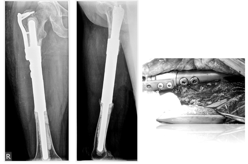 患者女性,68岁,乳腺癌病史,右股骨中段病理性骨折,股骨长段溶骨性破坏,并有跳跃病灶。病变的长度为16cm,病灶近端在小转移水平,因为近端髓腔柄较短,故选择A区骨干假体。经病理诊断为转移性腺癌,术后2周患者拆线后即可离床活动。