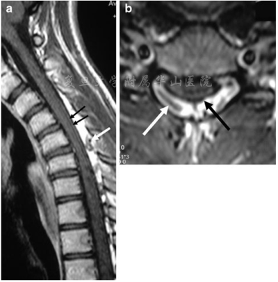 图2 屈颈位磁共振矢状和横断面T1相。(a,b)显示了造影剂给药后硬膜后壁的前移(黑色箭头)和扩大的硬膜囊后方空间。图像上可见血管流空影(白色箭头)