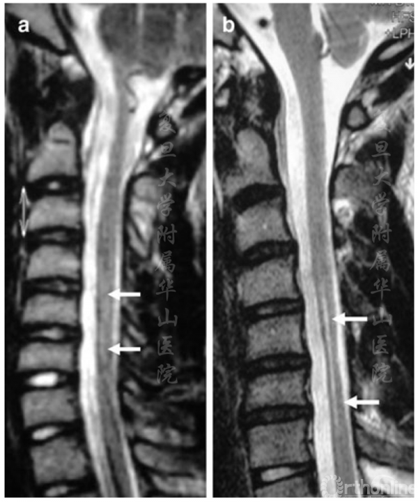 图1 MRI矢状面T2相 a.首次入院时进行的MRI检查显示C5-C6节段脊髓轻度高信号。b.四年后,出现了节段性萎缩和更明显的高信号