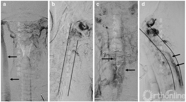 图3 左侧椎体血管造影晚期静脉相:前后位(a,c)和侧位(b,d),中立位(a,b)和屈颈位(c,d)。在中立位,右颈静脉清晰可见(a中的箭头),而当硬膜外静脉丛充血时,右颈静脉变得不透明(c和d中的箭头)。在b和d中勾勒了椎管的前后轮廓