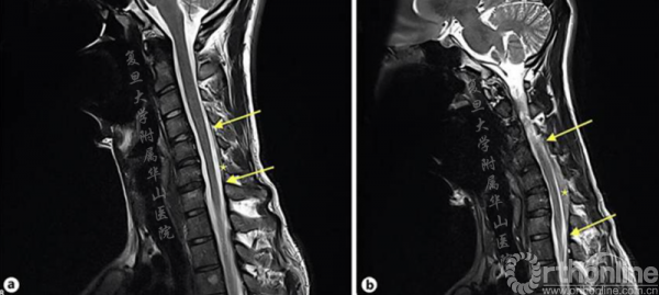 图2.MRI颈椎矢状位T2加权成像,a中立位,显示颈脊髓变直,C5-6水平节段的脊髓变细,可能反映脊髓萎缩;b过曲位,显示后硬膜前移,后硬膜空间扩大,“硬膜椎板间距离”增加,从到1.4~6.1mm(*),脊髓长度增加(←)