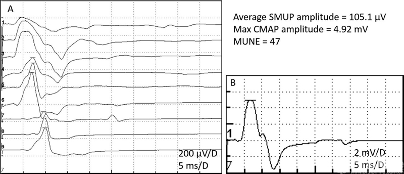 图1:一名平山病患者。在症状较轻的一侧小指展肌的MUNE值减少,同时CMAP波幅降低,SMUP平均波幅增加。左图(A)显示了腕关节(1-3)、腕近端4厘米(4-6)和肘部(7-9)的三个增量,右图(B)显示了最大CMAP。SMUP:单个运动单位电位;CMAP:复合肌肉动作电位;MUNE:运动单位数目估计