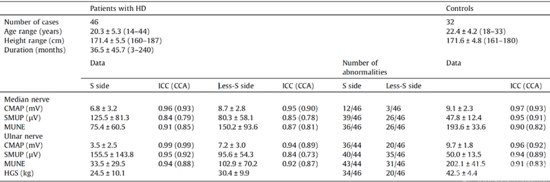 表1.平山病患者和对照组MUNE和握力的测量结果