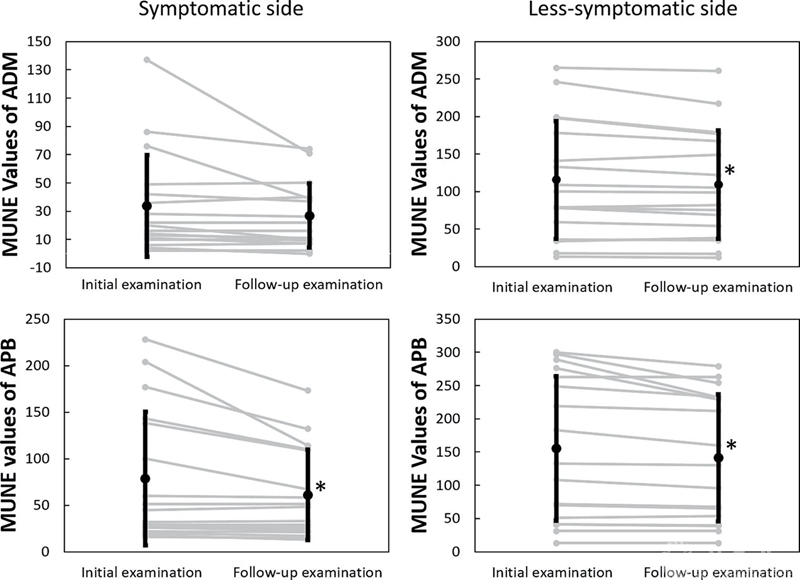 图4.单独病例(灰线)显示MUNE在初次检查和1年随访检查之间的变化。黑色粗线代表平均值和标准差。*: 平山病患者的MUNE平均值在随访检查中显著下降(P<0.05)