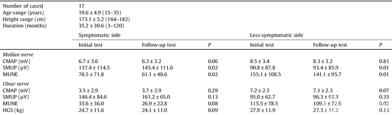 这17名患者与其他未参与随访研究的受试者在年龄、身高、病程等方面均无差异(P>0.05)。此外,在6名初诊时病程超过4年的患者中,1年随访时也发现症状侧APB中MUNE值异常降低(P<0.05)。在随访中,这6例患者中的1例症状侧ADM中的CMAP完全消失。
