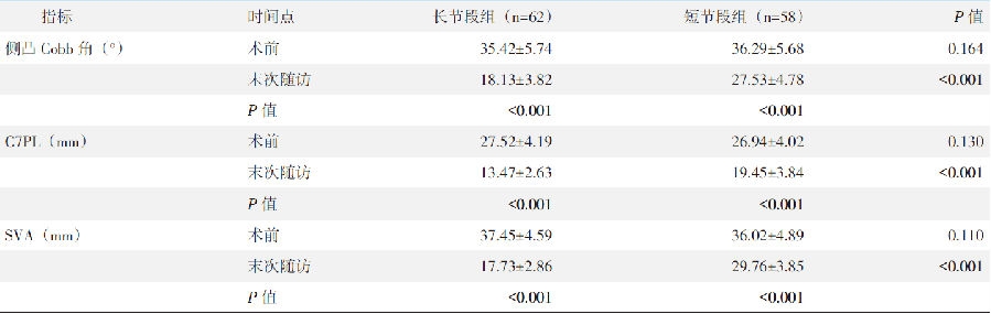 Cobb 角、C7 PL 和SVA 均显著减少(P<0.05)。末次随访时,长节段组的侧弯Cobb 角[(18.13±3.82) ° vs (27.53±4.78) °,P<0.05]、C7 PL [(13.47±2.63) mm vs (19.45±3.84) mm,P<0.05] 和SVA [(17.73±2.86) mm vs (29.76±3.85) mm,P<0.05] 均显著小于短节段组。