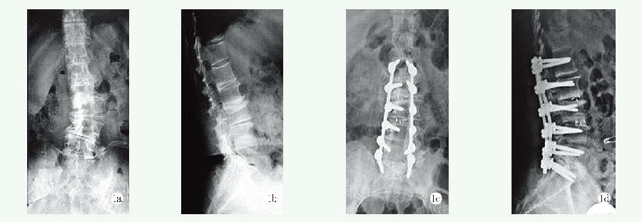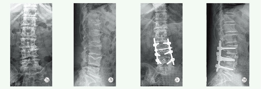 2a, 2b: 术前正侧位X 线片显示腰椎侧凸 2c, 2d: 术后正侧位X 线片显示侧凸Cobb 角获得部分矫正