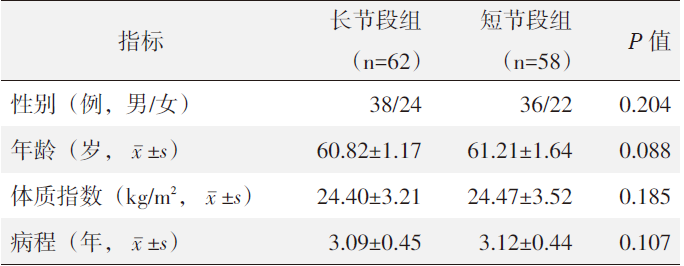 回顾性分析本院2017 年6 月—2019 年12 月收治的确诊为DS 患者的临床资料,共120 例符合上述标准,纳入本研究。依据术前医患沟通结果将患者分为两组,62 例接受长节段融合(长节段组),58例接受短节段融合方式(短节段组)。患者术前一般资料见表1,两组患者在性别构成、年龄、体质指数(body mass index, BMI) 和病程的差异均无统计学意义(P>0.05)。本研究通过医院伦理委员会批准备案,所有患者均知情同意。