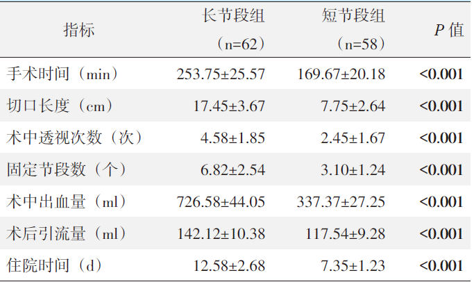 结果:两组手术均顺利完成,术中均未发生血管、神经损伤等严重并发症。短节段组手术时间、切口长度、术中透视次数、固定节段数、术中出血量、术后引流量和住院时间均显著优于长节段组(P<0.05)。所有患者均随访12 个月以上。与术前相比,末次随访时两组患者VAS 评分和ODI 评分均显著减少(P<0.05)。末次随访时,长节段组的VAS 评分[(1.42±0.86) vs (3.65±1.48),P<0.05] 和ODI 评分[(28.29±4.74) % vs (39.63±4.49) %,P<0.05] 均显著低于短节段组。影像方面,与术前相比,末次随访时两组患者侧弯