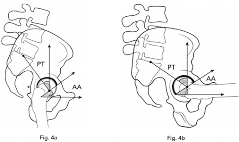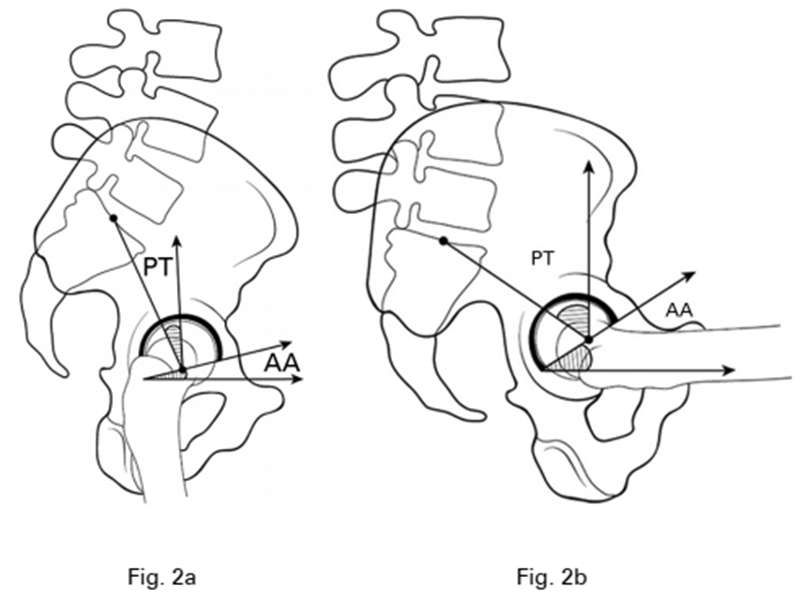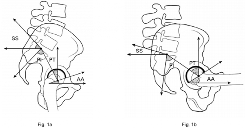 图1. 该示意图分别显示在站立位(a)和坐位(b)骨盆的测量指标。骨盆倾斜率(PI)在体位变化时维持恒定。从站立位变换至坐位时,骨盆倾斜角(PT)增大,相应地骶骨倾斜角(SS)减小,同时髋臼矢状面前倾角(AA)增大。PI=PT+SS