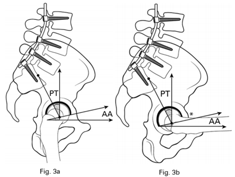 图5. 该示意图分别显示在站立位(a)和坐位(b),脊柱僵硬/失平衡状态下(R/U)骨盆倾斜角(PT)和髋臼矢状面前倾角(AA)。在站立位时,与脊柱柔韧/平衡状态下骨盆状况比较,由于腰椎后凸增加,PT和AA一定程度代偿性增大;因此在极度伸髋时,髋关节后方发生撞击的可能性增加。由站立位变换至坐位时,因腰椎融合至骶骨,PT和AA没有发生代偿性变化。(*站立位伸髋时可能出现后撞击)