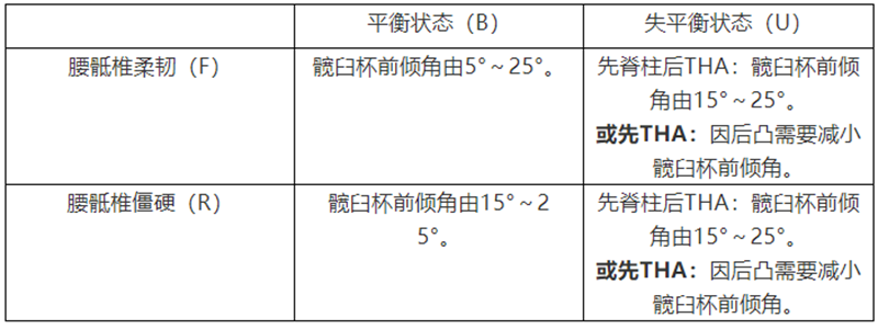 术前根据患者脊柱矢状面状况、和柔韧性,可分为4类(Phan分型):柔韧/平衡型(F/B),僵硬/平衡型(R/B),柔韧/失平衡型(F/U),和僵硬/失平衡型(R/U);依据这些信息指导,及同时存在的脊柱畸形的严重程度和类型,可将髋臼假体安放在理想方位。