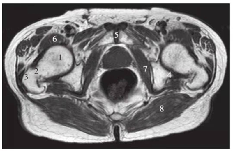 1.髂骨;2.臀大肌;3.圆韧带;4.股骨头;5.坐骨;6.闭孔外肌;7.耻骨肌;8.大收肌