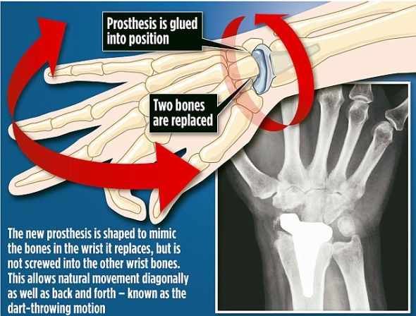 以前这些患者只能采用两种治疗方法:全腕关节置换术,利用金属移植物连接胳膊和手掌,借助一个隔离片分开彼此,让手掌可以活动;另一种方法是把腕部骨骼合并在一起。两种方法都会令腕部丧失一定活动能力。据尖顶和绍森德韦尔斯利大学医院的格雷格-帕克说,全腕关节置换术在糟糕的上举能力方面尤为突出。每年采用这项手术的4000名患者中,能够从中受益的不足十分之一。他于今年3月实施了这项先驱性手术。
