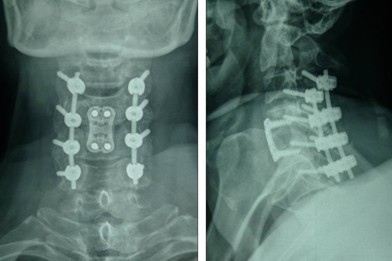 经相关科室会诊,认为无明确溶栓指征,建议严密监测生命体征,呼吸机支持,保持呼吸道通畅,敏感抗生素治疗肺部感染,予以低分子肝素4100IU Q8h皮下注射抗凝。经治疗1周后,患者呼吸困难明显缓解,不使用呼吸机情况下血氧饱和度可维持在98%以上,心超提示肺动脉压下降,D-二聚体水平逐渐 下降。2009.9.1复查肺动脉造影示:双侧肺动脉附壁血栓,栓塞情况明显好转(图4)。后改为低分子肝素4100IU Q12h维持抗凝。2009.10.12停用低分子肝素,2010.10.15行颈后路减压植骨融合内固定术治疗(图5)。术后继续予低分子肝素 4100IU Qd维持抗凝,病情平稳,术后1周复查再次肺动脉造影示血管再通,遂予以出院。目前定期随访中,一般情况良好,双上肢肌力Ⅳ级,双下肢肌力Ⅲ级,生活基本 自理。