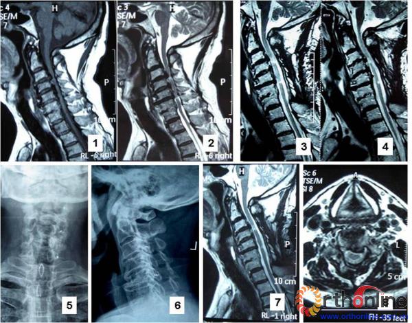 本组25例,男21例,女4例;年龄35~78岁,平均63.5岁。均为多节段脊髓型颈椎病,3节段者18例,4节段者7例。其中合并发育性或退变性颈椎管狭窄20例,其中8例发育性颈椎管狭窄,其颈椎管中矢状径与颈椎体中矢状径的比值平均为0.69±0.021,至少有三个节段低于0.75。发病至确诊时间1.6至18年,平均3.6年。临床表现为肌张力增高,肌力减退,四肢麻木、疼痛,胸腹部束带感,握力差,行走无力,霍夫曼征阳性等。均行颈椎单开门椎管扩大术,节段均为C3~C7,锚定节段为C3、C5、C7。患者术前均行颈椎正、侧位及过伸、过屈动态侧位X线片和MRI检查。开门节段均为C3~C7,锚定节段为C3、C5、C7。术前25例患者均行JOA评分,3分~11分,平均6.7±2.2分。