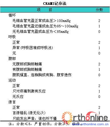近年来,Gormican等人研究了用于现场分类的另一方法——“CRAMS评分法”。该方法评定的范围包括循环(circulation)、呼吸(respiration)、腹部(abdomen)、活动(motor)和语言(speech)五个方面。每个方面记~2分,一共~10分。“CRAMS评分法”的命名是来自以上五个方面的第一个字母。该记分法按正常、轻度异常和严重异常分别记以2、1和分。最后五项分数相加,9~10分为轻度创伤,8分以下为重度创伤。该方法能在现场把严重刨伤病人与一般创伤病人区分开来(见下表)。