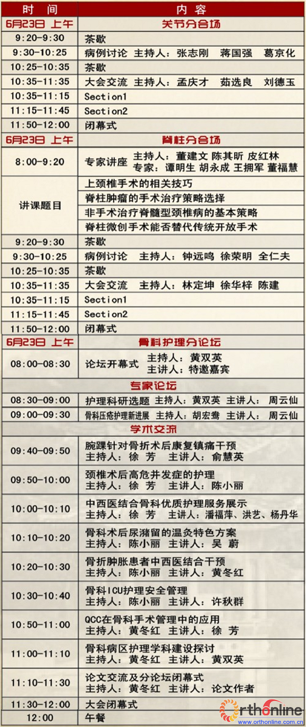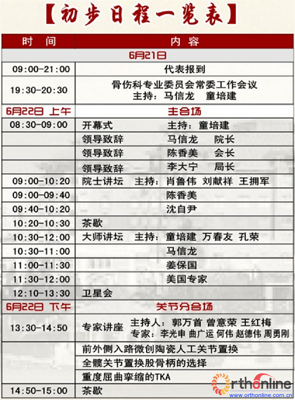 会议形式:1、院士讲坛。2、国内、外著名骨伤科专家专题讲座。3、参会代表优秀论文交流、青年论坛。4、疑难病例讨论。