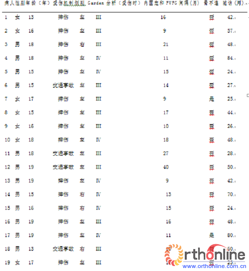纳入我们研究的病人有8个女性和20个男性,手术时平均年龄16.3(13-19岁)。所有病人股骨颈骨折都是由于高能量损失引起的移位(GardenⅢ或Ⅳ型)。3例头下型,25例经颈型(如表Ⅰ)。所有病人最初都经过切开复位内固定,内固定器械包括空心钉,钢板和股骨近端髓内钉。从第一次手术到吻合血管腓骨移植平均时间为17.3月(8-40月)。2例病人股骨头坏死伴有股骨颈骨不连。