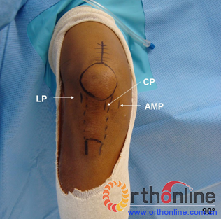 右膝关节ACL重建入路位置,前外入路(LP),中间入路(CP)和前内辅助入路(AMP)。