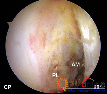 右膝关节屈膝90度,由中间入路进镜,可直接观察到ACL的股骨止点位置,髁间窝外侧壁。