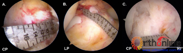 图6:右膝关节屈曲90度,关节镜下使用测量尺对止点进行测量。