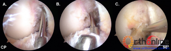图7:右膝关节屈曲90度,中间入路观察的关节镜示图。该图比较了三种钻取AM股骨隧道的方式:A、经AM胫骨隧道钻取;B、经PL胫骨隧道钻取;3、经前内辅助切口钻取。通过比较,只有经前内辅助切口才能使导针到达AM股骨解剖位置。