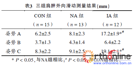 表3显示,CON组三种姿势测量结果与NA组比较均无显著性差异(P > 0.05),三组在姿势B时测量结果也无显著性差异(P > 0.05);在姿势A和姿势C时测量,结果,IA组显著大于CON组和NA组(P < 0.001)。